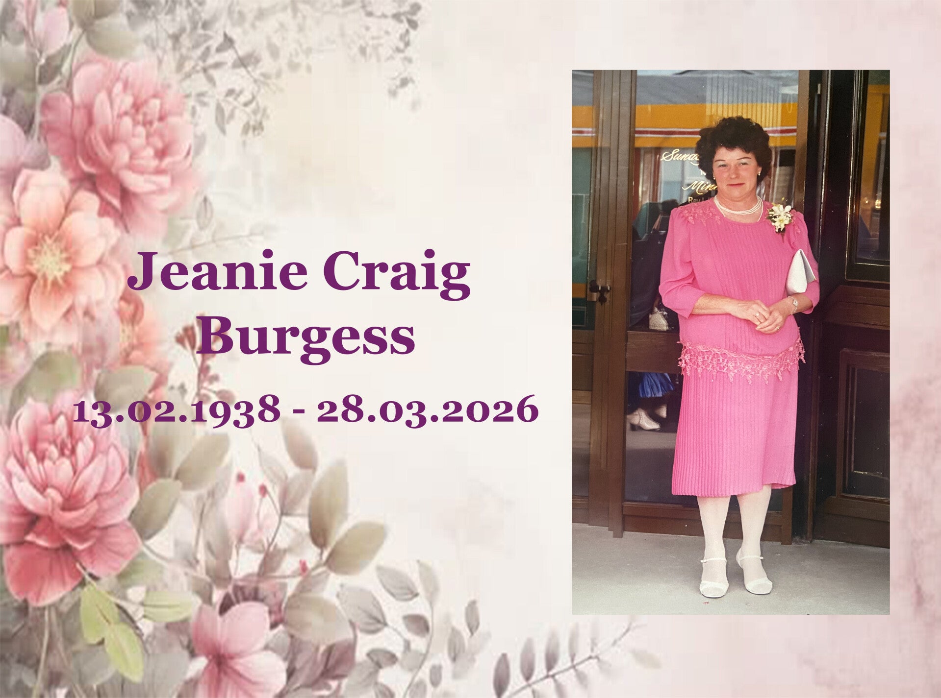 BURGESS, Jeanie Craig (nee Dabinett). With her sons by her side, at Holmdene on March 28, 2026; aged 88 years.