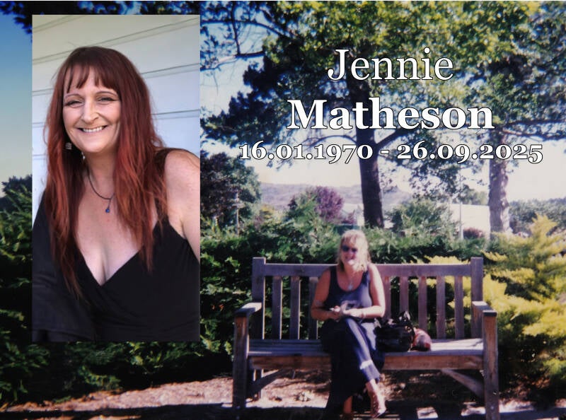 Matheson, Jennifer Lea (Jennie), Piccolo Lifetime soulmate of Rob, Loved mum of Aliah, Gina and Johvan. Loved Nana–Mima of Jayda and Georgia (Mokopuna).
